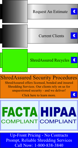 Please click here for more information, or give us a call at 1-800-838-3840 to find out how ShredAssured can help your company save money, protect its information, and comply with federal and state laws. Our client specialists are ready to assist and willing to help in any way they can.